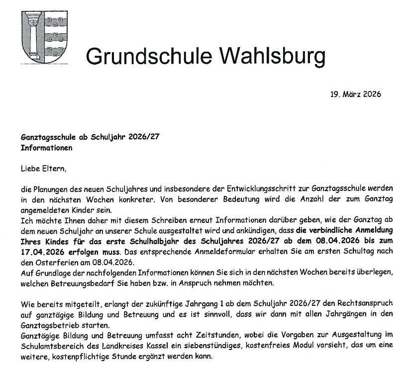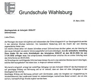 Wer Infos über die Betreuung an der Grundschule Wahlsburg benötigt, kann sich auf dieser Homepage unter „Unsere Schule“ – „Betreuung“ informieren und jegliche Formulare herunterladen.